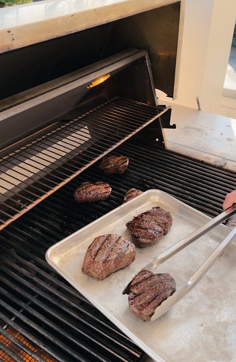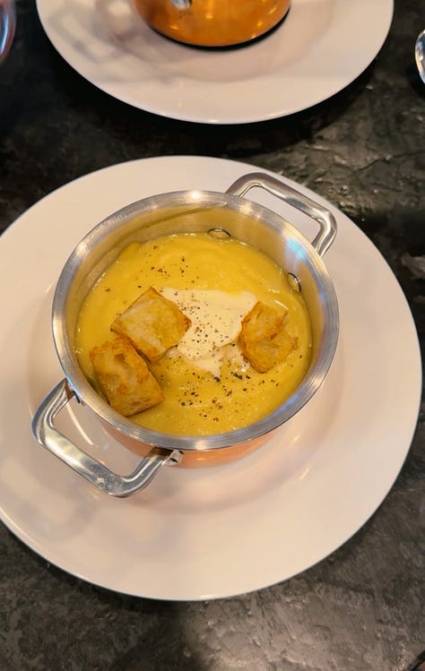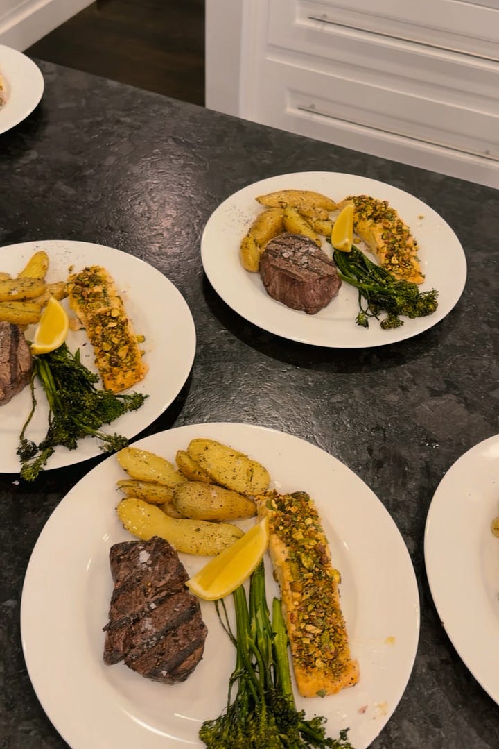 As for the menu, we kept it simple and seasonal. Mom took the lead, and true to form, her idea of an easy Saturday night is somehow still completely impressive. We started with one of my favorite soups of the season, moved into a stunning surf and turf of filet and salmon alongside roasted potatoes and broccolini, and finished the evening with a warm apple cranberry crumble. All the recipes from this evening are below and they are all as easy as they sound, and every single one has a spot on our regular rotation.